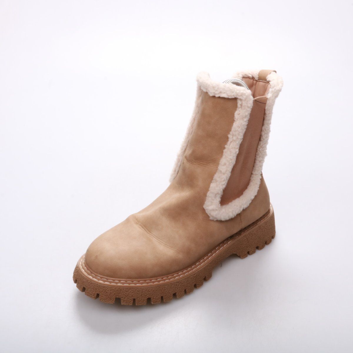 Женские зимние ботинки без указанного бренда в бежевом цвете с отделкой из мягкого меха по верху. Подойдут для повседневных прогулок в холодную погоду и сочетания с джинсами или утеплёнными брюками. Рифлёная подошва даёт более уверенное сцепление на скользких поверхностях.
