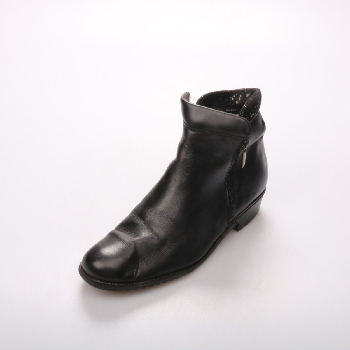 Женские ботинки Madicus из гладкой чёрной кожи, укороченная модель на молнии сбоку и с небольшим устойчивым каблуком. Подойдут для повседневной носки в демисезон и к базовым образам с джинсами или брюками. Практичная рельефная подошва даёт лучшее сцепление и комфорт при ходьбе.