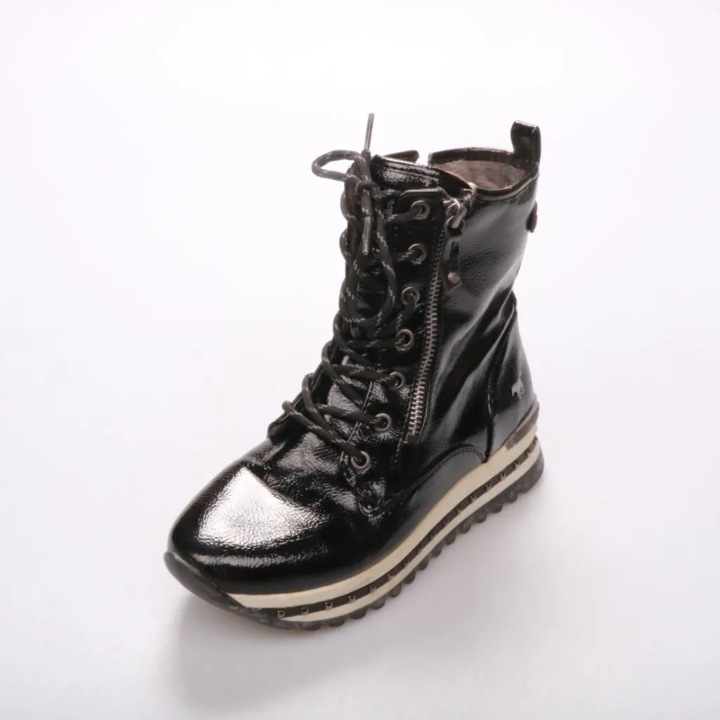 Женские ботинки Mustang из чёрной лаковой экокожи на высокой подошве, со шнуровкой и боковой молнией. Подойдут для повседневной носки в демисезон, хорошо сочетаются с джинсами и платьями. Молния облегчает надевание, а рифлёная подошва даёт более уверен...