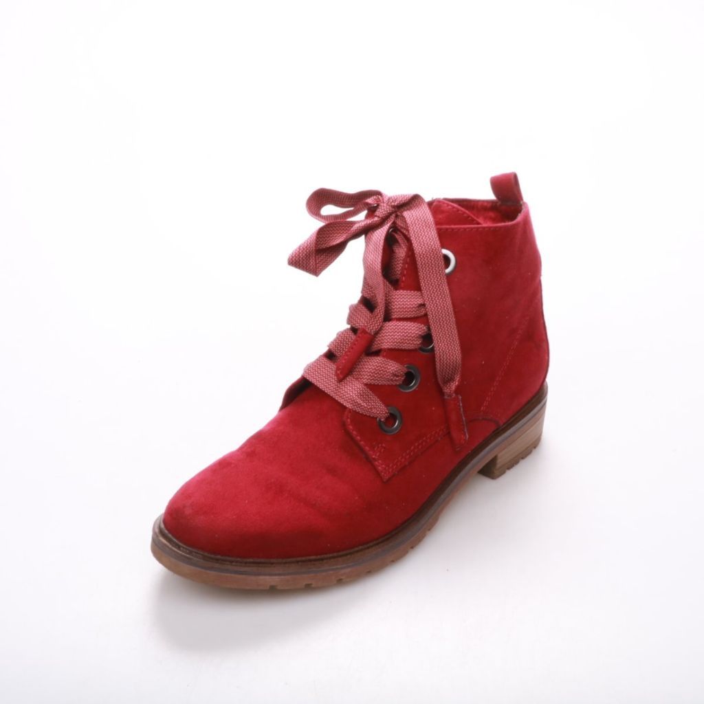 Женские ботинки Marco Tozzi из красной натуральной замши, на шнуровке и с боковой молнией. Подойдут для повседневной носки в прохладную погоду весной и осенью. Практичное преимущество — устойчивая подошва с протектором и удобная посадка за счёт шнуровки.