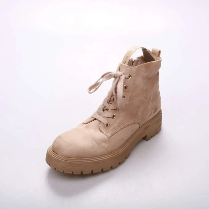Женские ботинки на шнуровке и боковой молнии, верх выглядит как замша бежевого цвета. Подойдут на каждый день в демисезон, хорошо сочетаются с джинсами и платьями. Практичное преимущество — рельефная тракторная подошва даёт более уверенное сцепление.