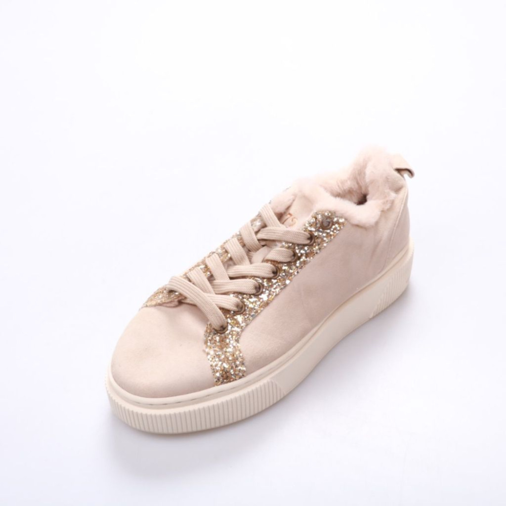 Женские утеплённые кроссовки Cycleur de Luxe в бежевом цвете с декоративными вставками под глиттер и мягкой меховой окантовкой. Подойдут для повседневной носки в холодную погоду и городских прогулок. Практичное преимущество — тёплая подкладка и устойчи...