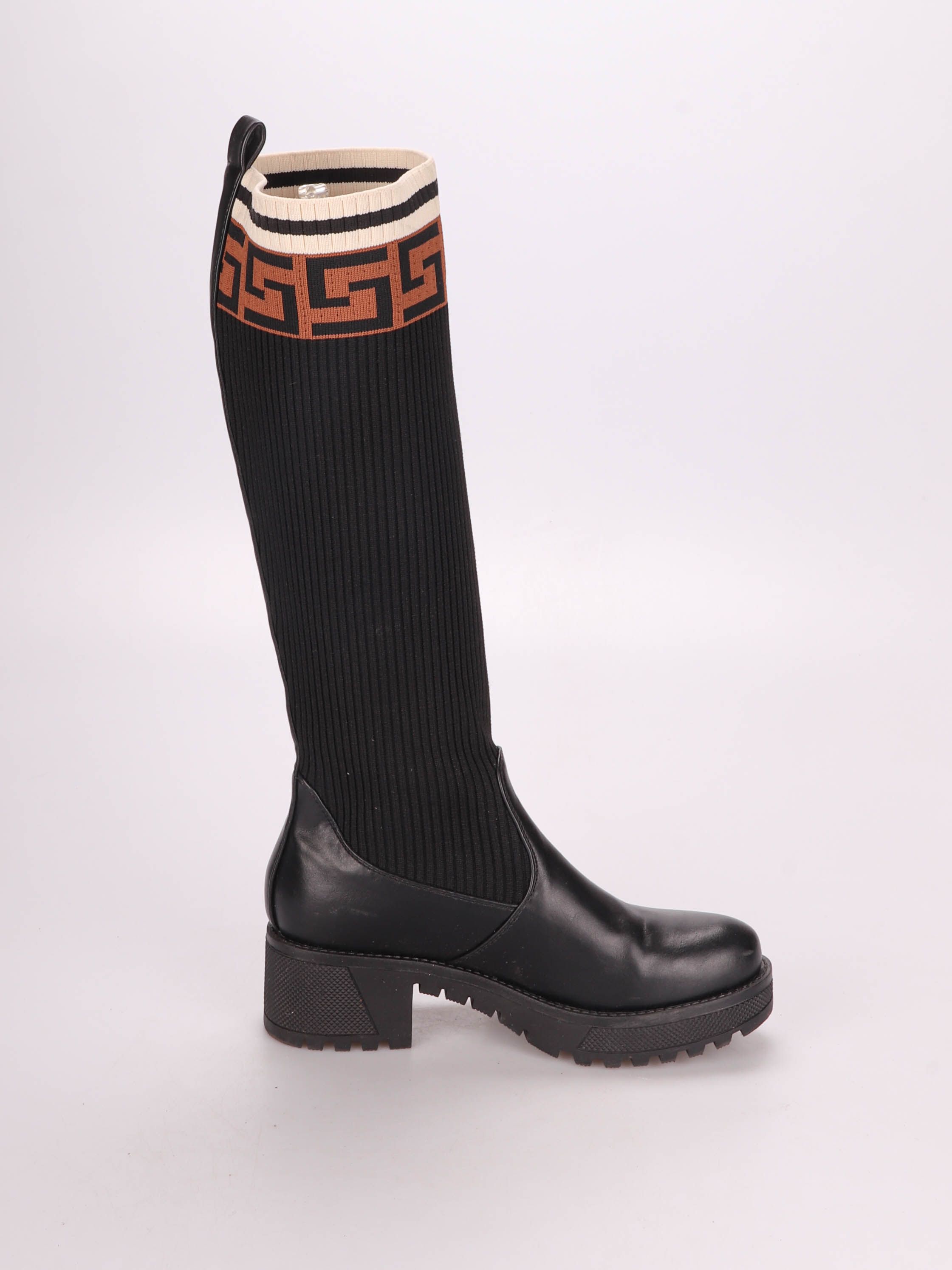 Женские сапоги-«чулки» без бренда: чёрный верх в рубчик с контрастным орнаментом и гладкая нижняя часть. Подойдут для демисезона и городских образов с платьями, юбками и узкими брюками. Устойчивая подошва с тракторным протектором даёт хорошее сцепление...