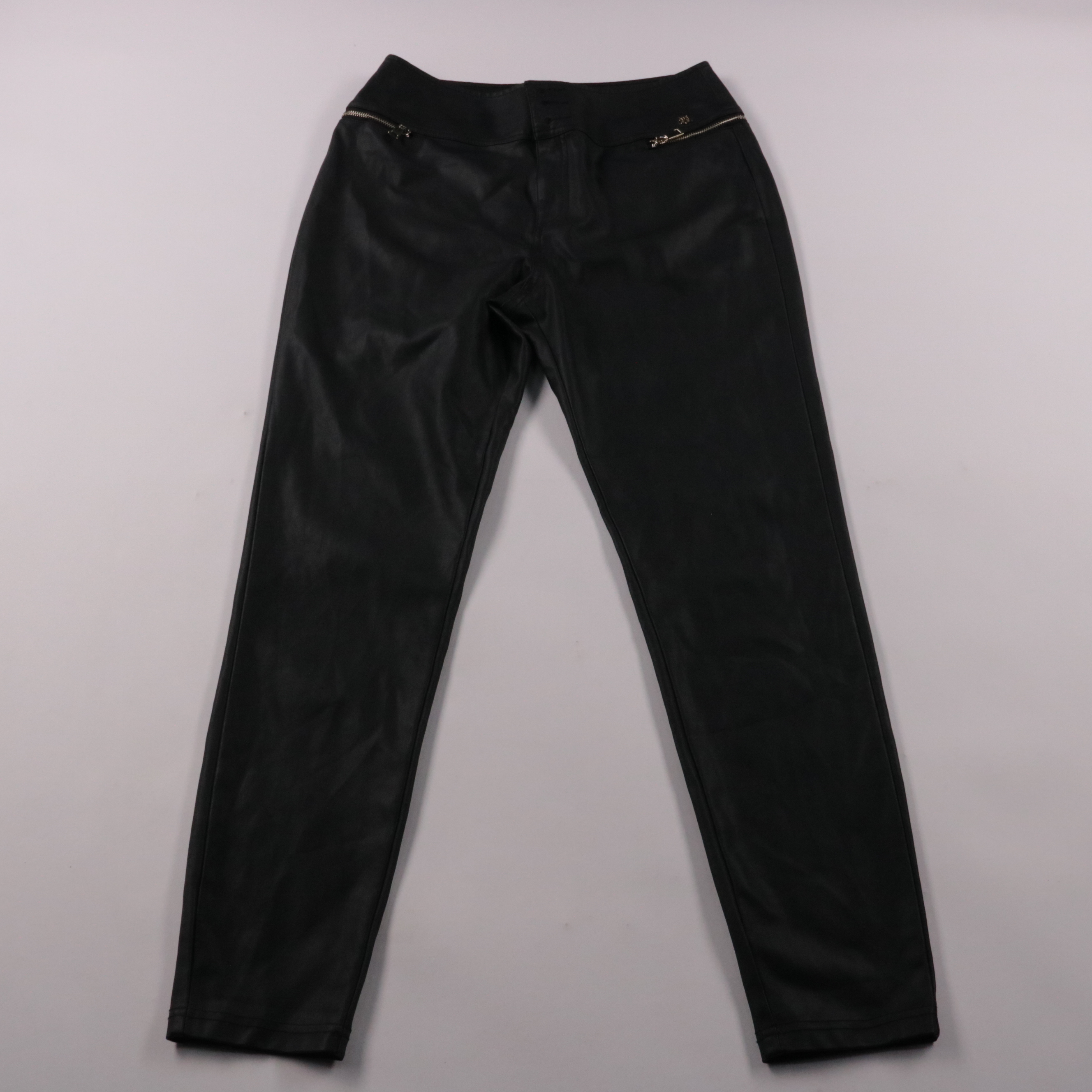 Женские чёрные брюки River Island из гладкого материала с молниями-карманами спереди. Подойдут для повседневных и вечерних образов с рубашкой, свитером или жакетом. Практичны тем, что легко сочетаются с обувью на каблуке и с кедами.