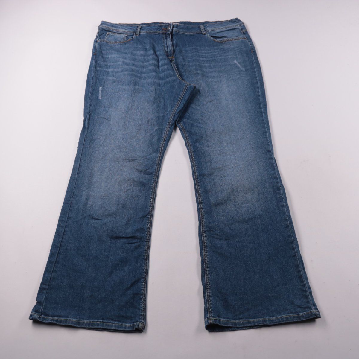 Женские джинсы TU из синего денима с лёгкими потёртостями и расклешённой штаниной. Подойдут для повседневной носки и сочетаний с кедами или ботинками. Плотная ткань со стрейчем комфортно садится по фигуре и держит форму.