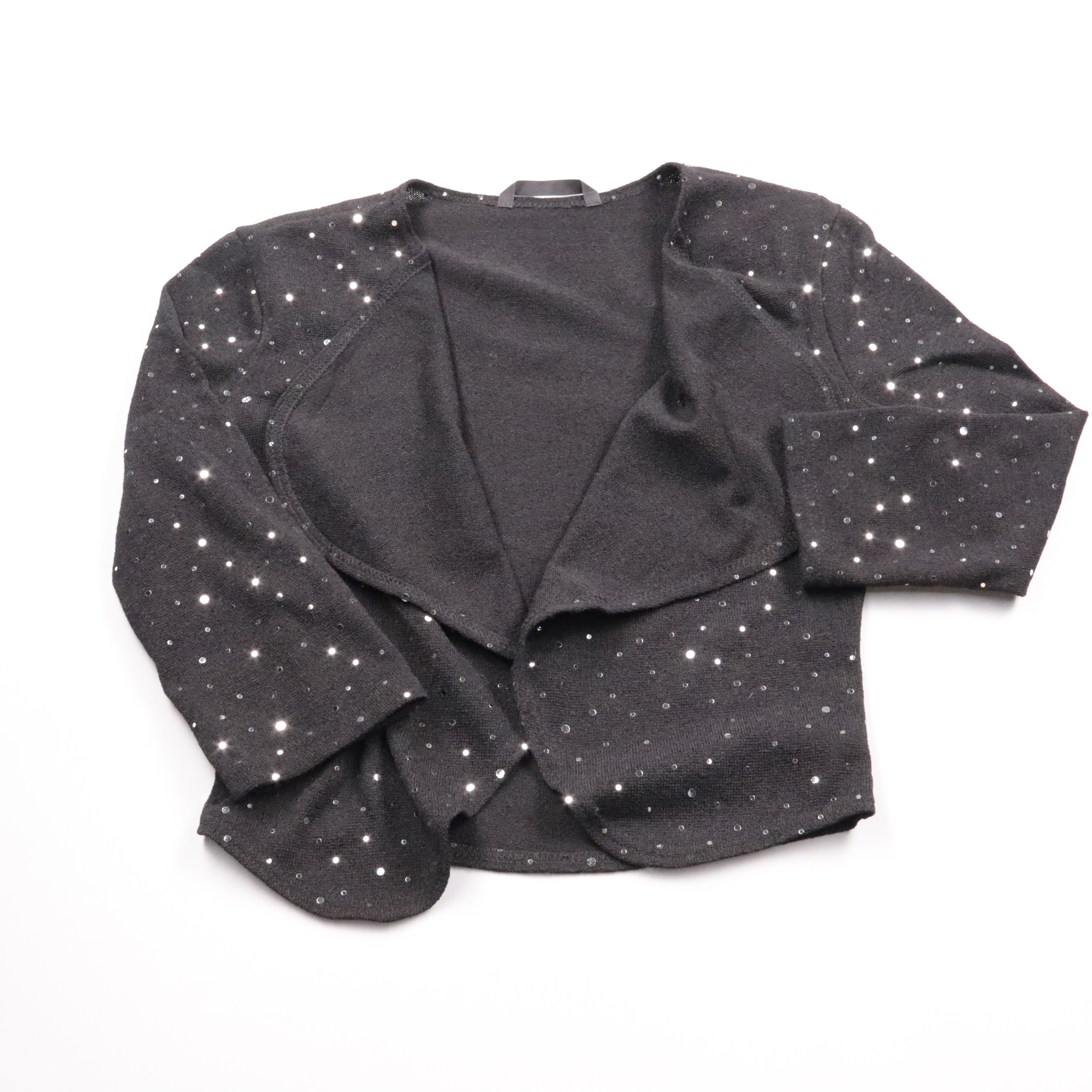 Чёрный пиджак Dunnes укороченного кроя с блёстками по всей поверхности. Подойдёт для вечера, праздника или как акцент к базовому образу с джинсами и платьем. Лёгкий материал почти не мнётся и комфортно тянется.