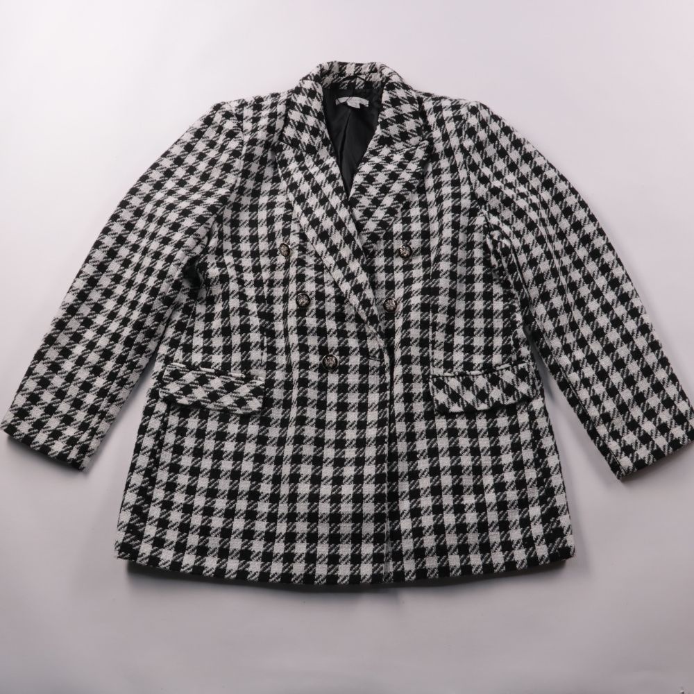 Двубортный пиджак Primark в черно-белую клетку (гусиная лапка), с лацканами и накладными клапанами карманов. Подойдёт для офиса и повседневных образов с джинсами или брюками в прохладную погоду. Плотная ткань и подкладка помогают держать форму и комфор...