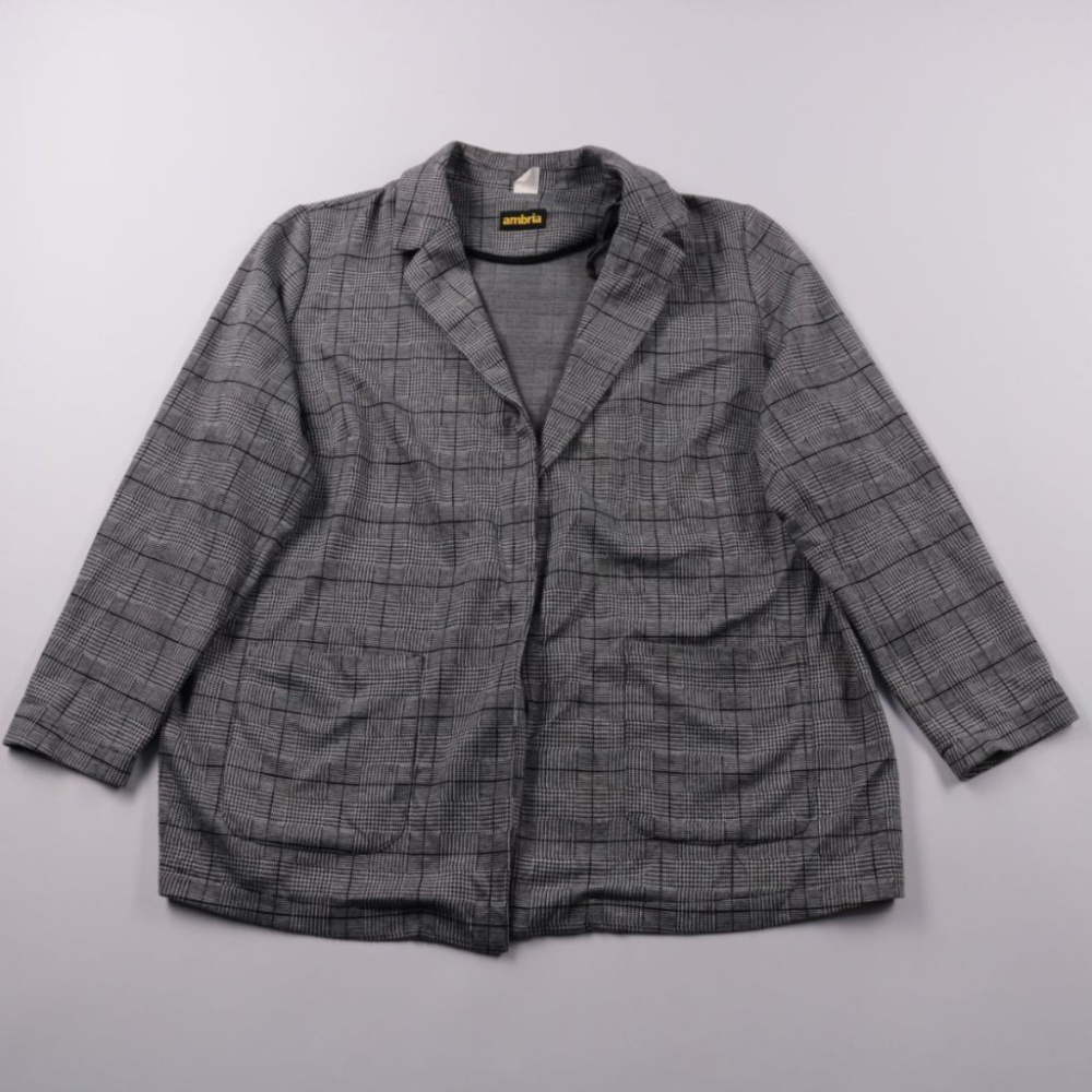 Женский пиджак Ambria серого цвета в клетку, удлинённого прямого кроя с накладными карманами. Подойдёт для офиса и на каждый день, легко сочетается с базовыми топами и брюками/джинсами. Практичный материал с эластаном слегка тянется и комфортен в носке.