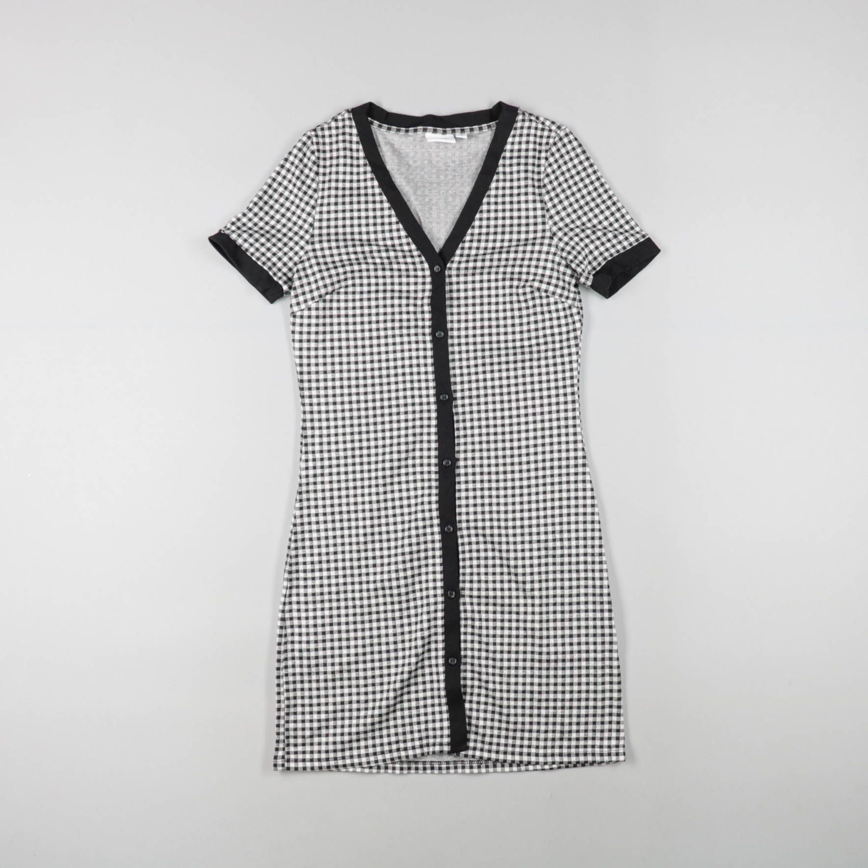 Платье в мелкую клетку (vichy) с коротким рукавом и V‑вырезом, застёгивается на пуговицы по всей длине. Подойдёт для повседневных летних образов и прогулок, хорошо сочетается с кедами или босоножками. Практичный плюс — трикотажный материал и застёжка с...
