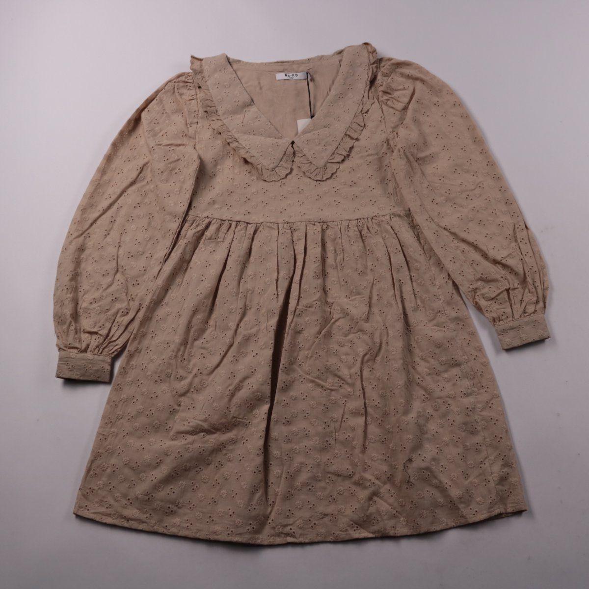 Повседневное платье NA-KD бежевого цвета с вышивкой ришелье (англез) и пышными рукавами. Подойдёт для прогулок и повседневных образов в тёплую погоду. Лёгкая ткань и подкладка делают его комфортным в носке.