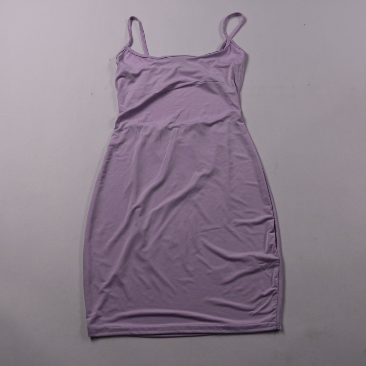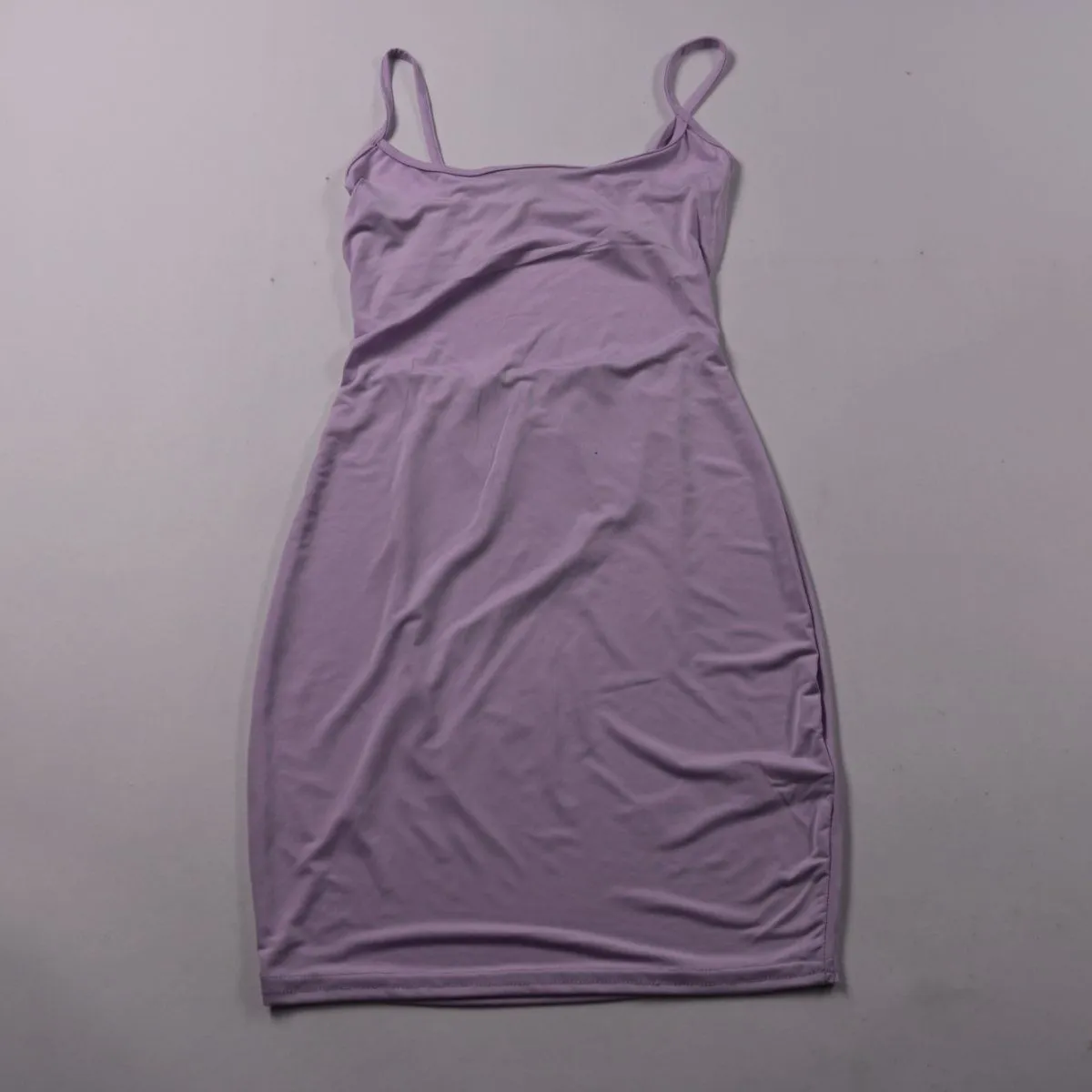 Повседневное облегающее платье-комбинация PrettyLittleThing на тонких бретелях, лавандового цвета. Подойдёт для лета, отпуска и прогулок, можно носить с жакетом или кардиганом. Тянущийся материал комфортно садится по фигуре и не стесняет движений.