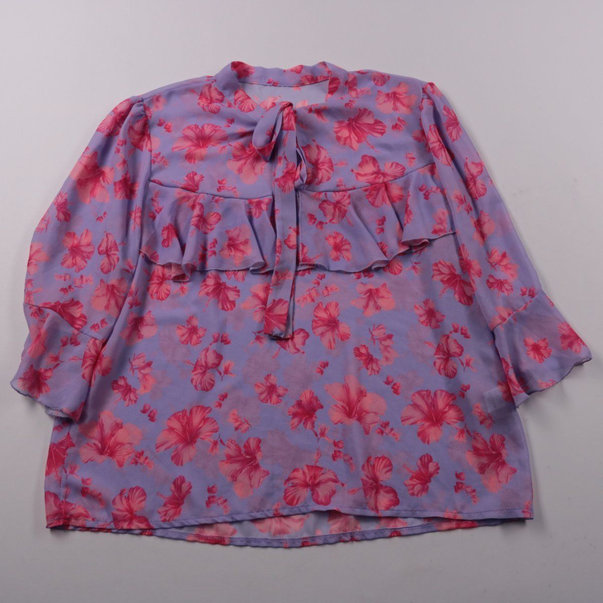 Лёгкая женская блузка с цветочным принтом и завязкой у горловины, с декоративной оборкой спереди. Подойдёт для тёплой погоды и повседневных образов с джинсами или юбкой. Практичный плюс — ткань из полиэстера почти не мнётся и быстро сохнет.