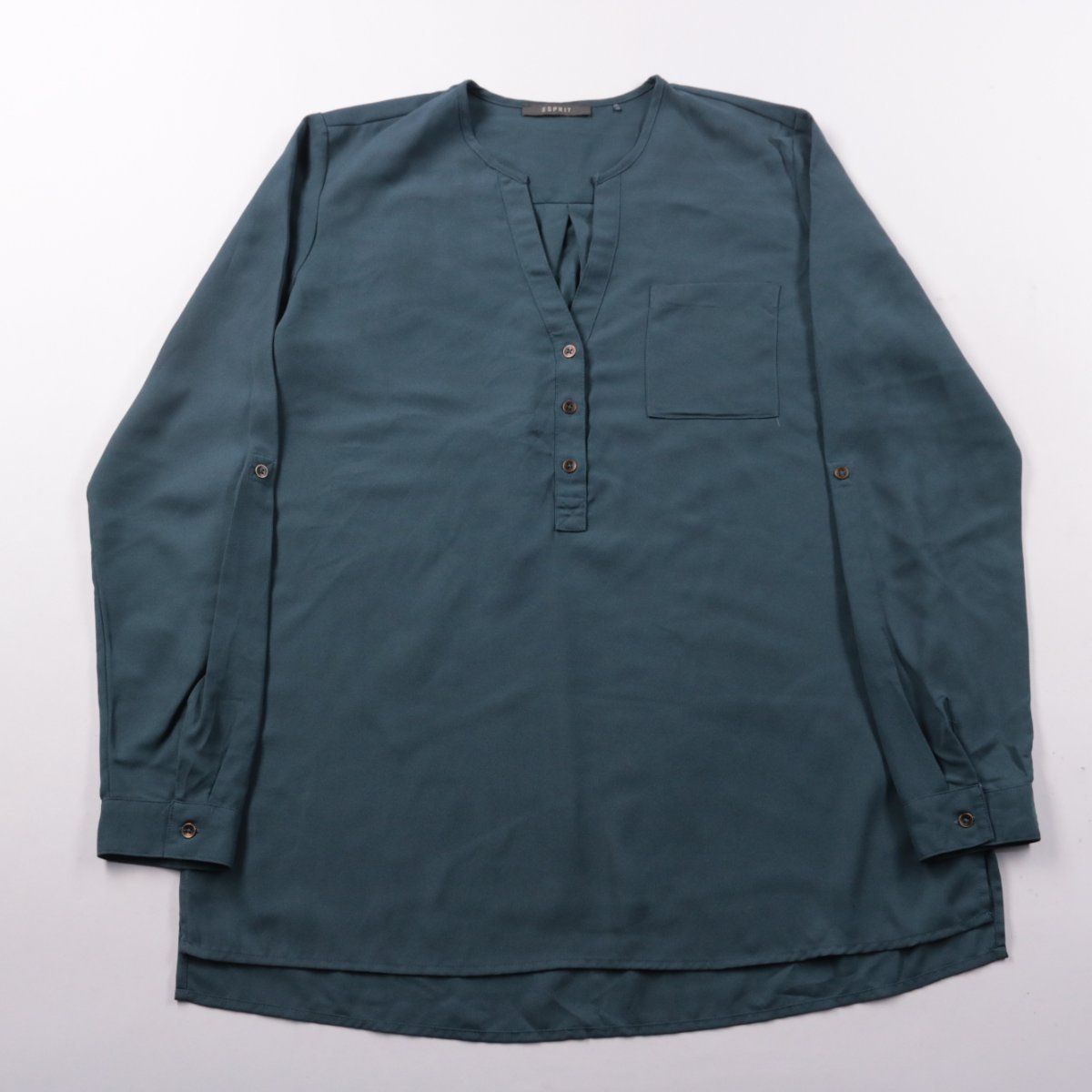 Блузка Esprit тёмно-бирюзового оттенка с длинным рукавом и планкой на пуговицах, есть нагрудный карман. Подойдёт для офиса и повседневных образов, хорошо сочетается с джинсами и брюками. Практичный плюс — лёгкая полиэстеровая ткань почти не мнётся и быстро сохнет.