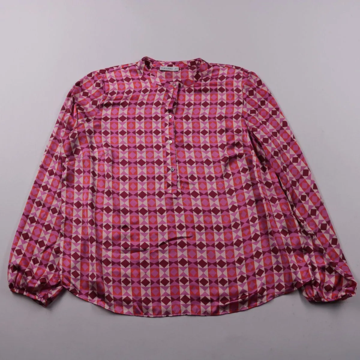 Женская блузка Gallery с геометрическим принтом в розово-фиолетовой гамме и планкой на пуговицах. Подойдёт для офиса и повседневных образов, хорошо смотрится как навыпуск, так и заправленной. Лёгкий полиэстер почти не мнётся и быстро сохнет.