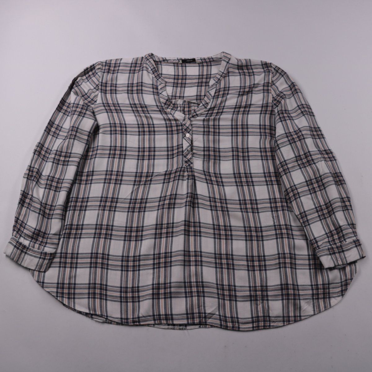 Блузка George в клетку, свободного кроя с V-образным вырезом и застёжкой на пуговицы. Подойдёт для повседневных образов и офиса в стиле casual. Легко сочетается с джинсами и однотонными брюками.