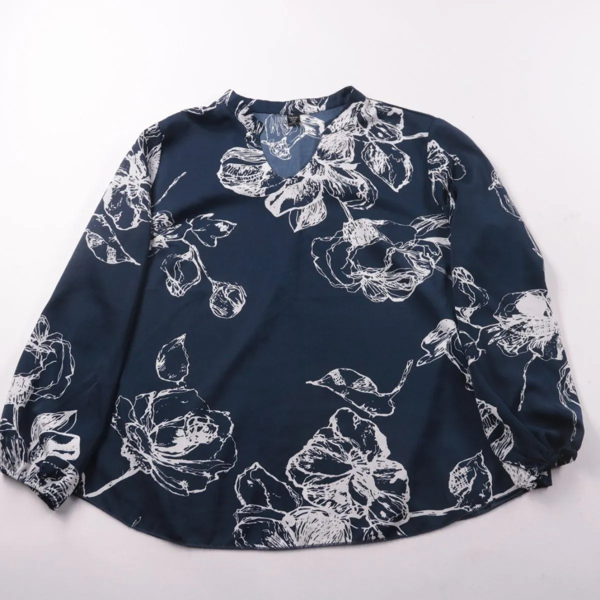 Женская блузка Shein Curve тёмно-синего цвета с белым цветочным принтом и V-образным вырезом. Подойдёт для повседневных образов и офиса в сочетании с брюками или джинсами. Лёгкая ткань из полиэстера почти не мнётся и быстро сохнет.