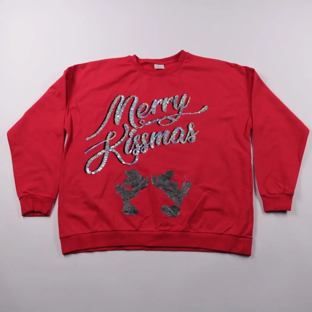 Женский свитшот Disney красного цвета с блестящим принтом «Merry Kissmas». Подойдёт для повседневной носки и новогодних образов. Мягкий трикотаж и манжеты по низу и рукавам помогают вещи держать форму.