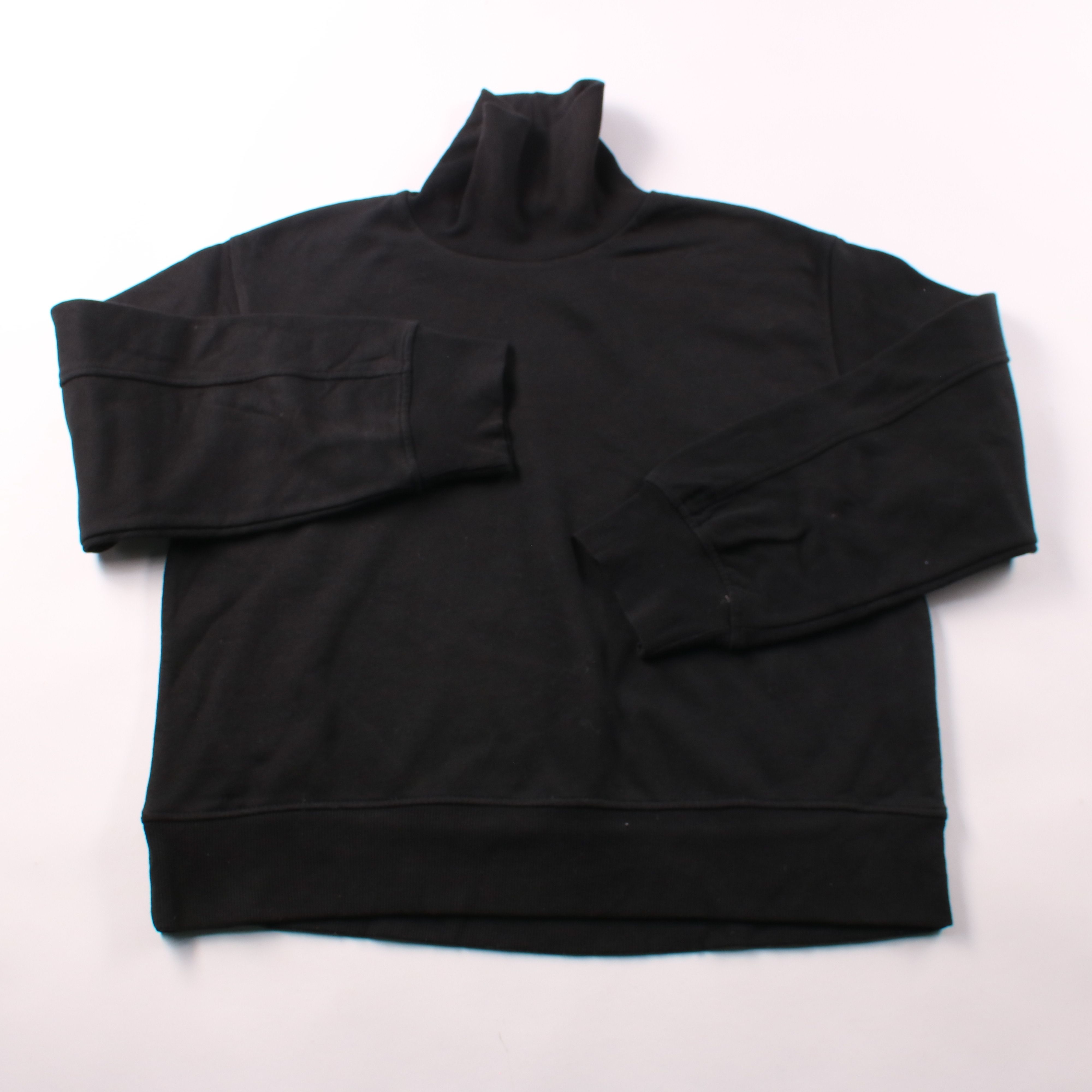 Черный свитшот без капюшона с высоким воротником-стойкой и длинными рукавами. Подойдет для повседневных образов и как утепляющий слой в прохладную погоду. Практичен тем, что легко сочетается с любой базовой одеждой.