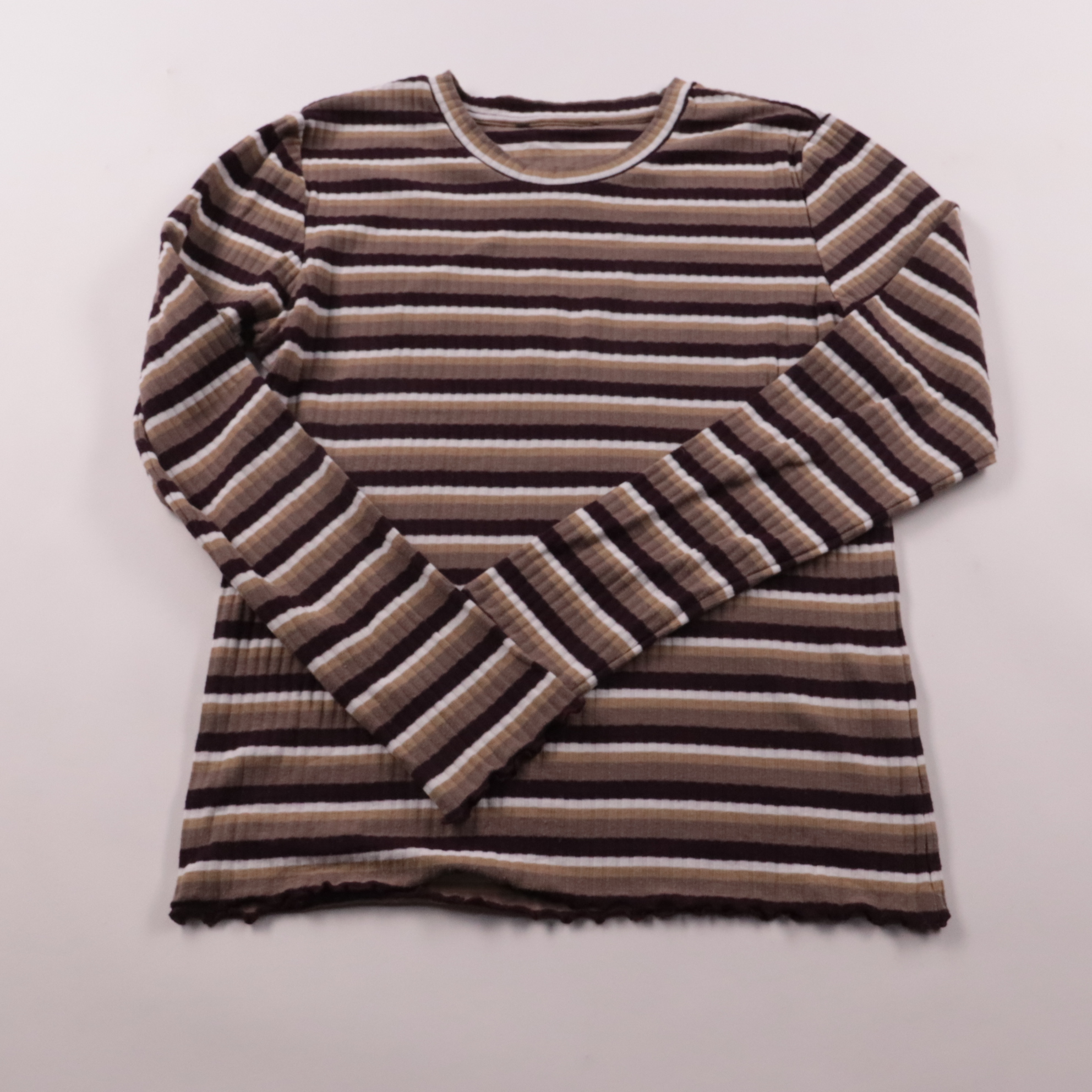 Женский лонгслив H&M из трикотажа в рубчик с горизонтальными полосками в бежево-коричневой гамме. Подойдёт на каждый день и для многослойных образов в прохладную погоду. Материал тянется и комфортно садится по фигуре.