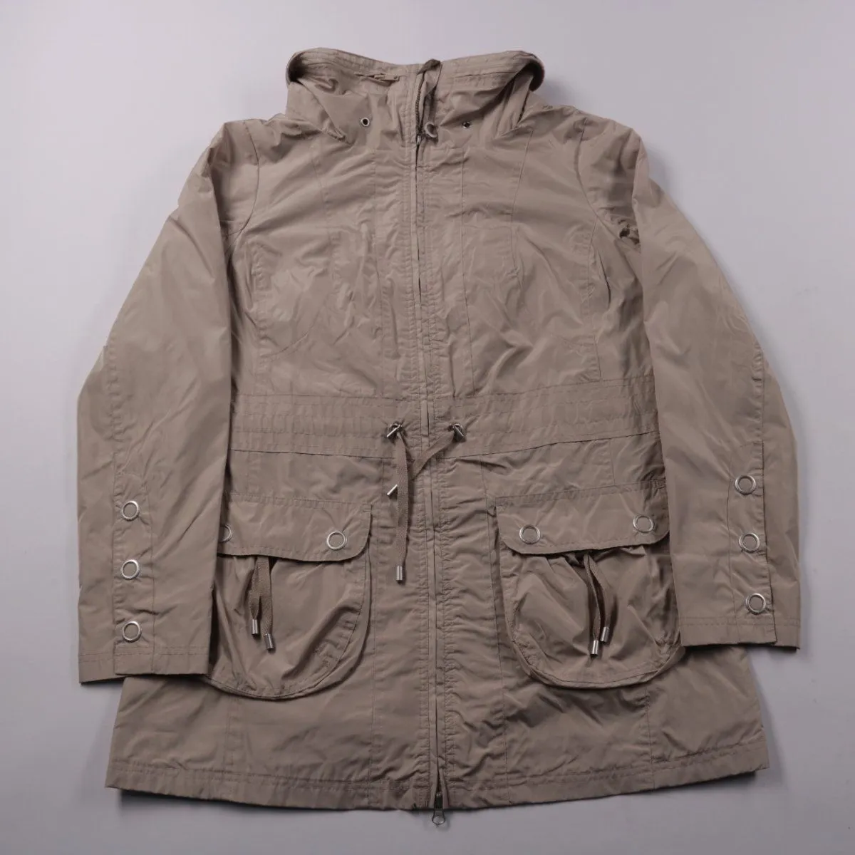 Демисезонная куртка Touch of Summer бежевого цвета с капюшоном, утяжкой на талии и удобной длиной до бедра. Подойдёт для прогулок и повседневных дел в прохладную погоду, а вместительные накладные карманы помогают держать мелочи под рукой.