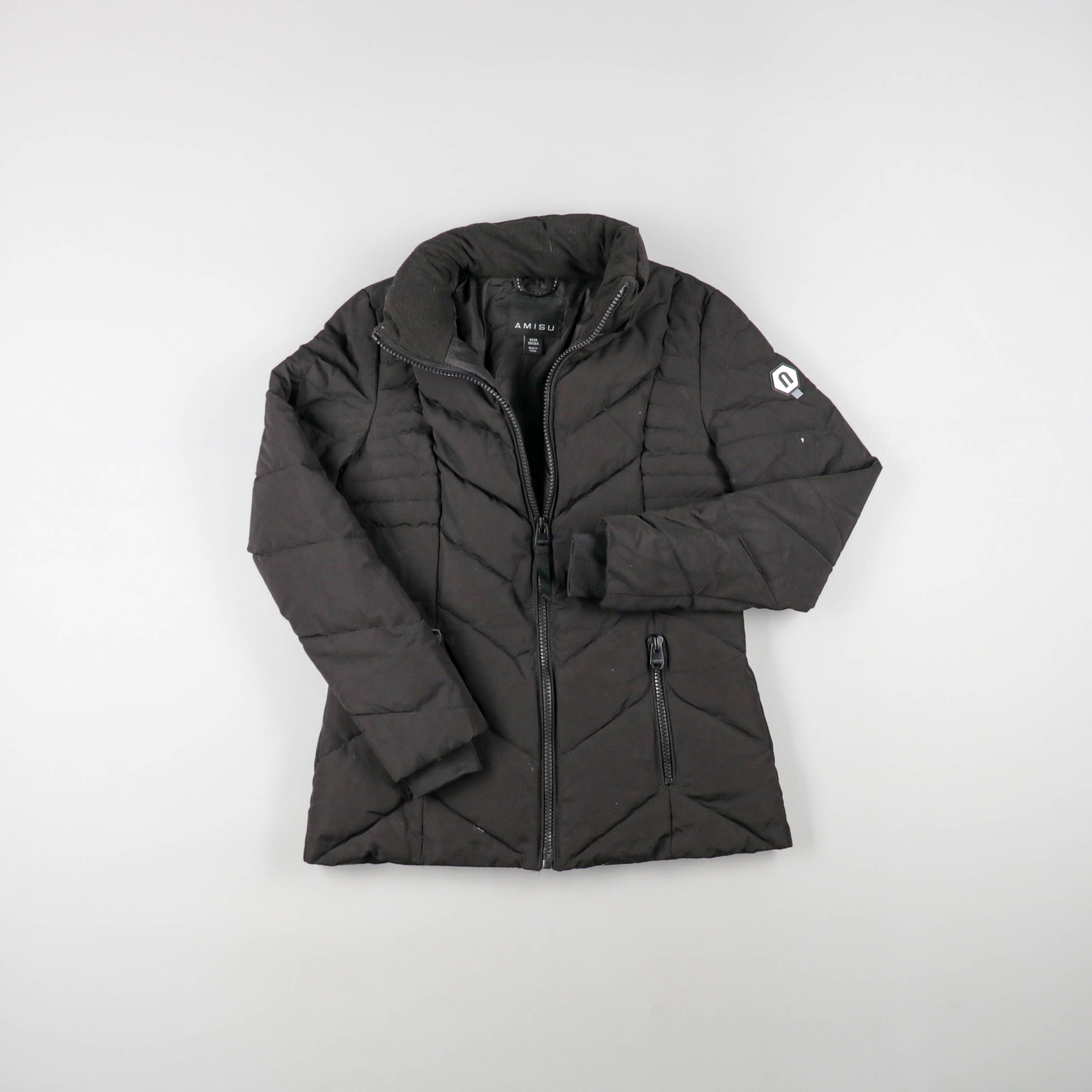 Женская стёганая куртка Amisu чёрного цвета с высоким воротником и застёжкой на молнию. Подойдёт для зимних прогулок и повседневной носки в городе. Практичный плюс — тёплый наполнитель и боковые карманы на молнии.