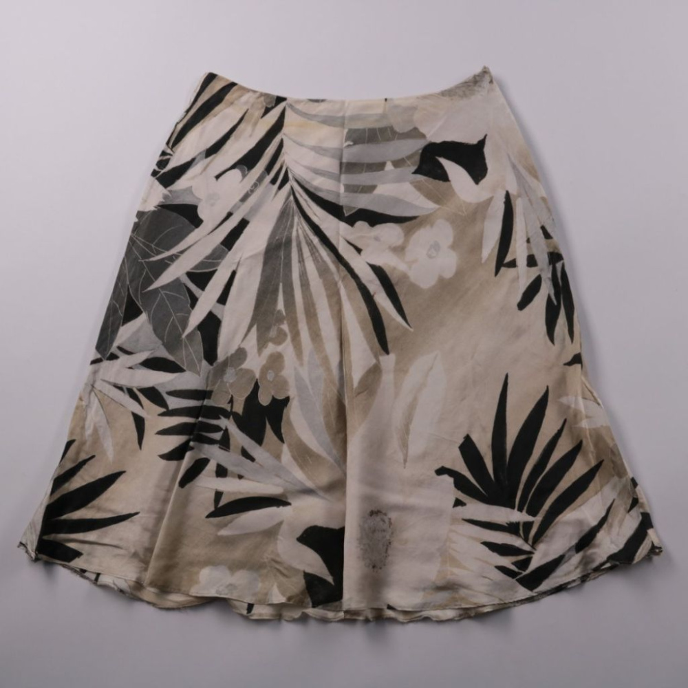 Юбка Taifun с тропическим принтом в бежево-чёрной гамме, длина до колена, силуэт слегка расклешённый. Подойдёт для летних прогулок и отпуска, легко сочетается с однотонными топами и рубашками. Лёгкая ткань комфортна в жару и быстро сохнет после стирки.